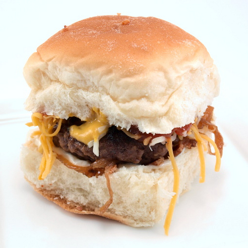 Mini angus burgers topped with cheese, onions, tomatoes and lettuce greens.