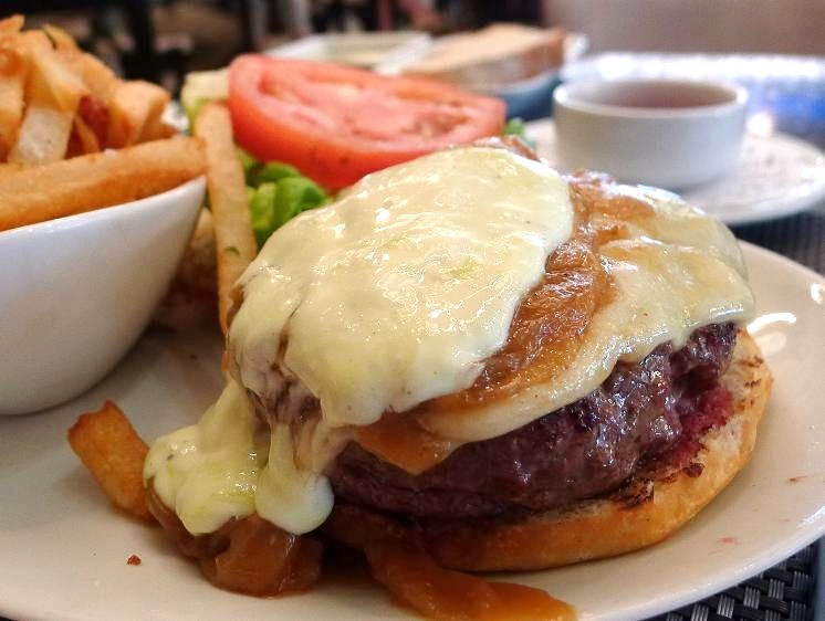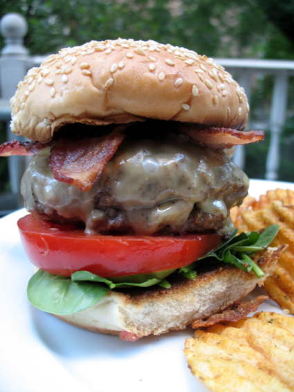 Gruyère cheese, smoky bacon, caramelized onions, roasted garlic aïoli and baby arugula on toasted onion bun.