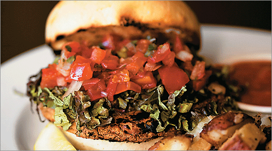 Sun-dried tomatoes, sauteed mushrooms top this all-vegetable patty that sits on a bed of greens
